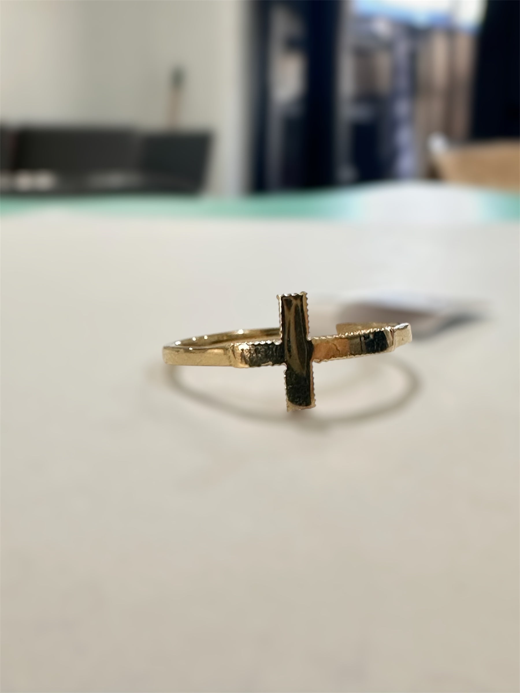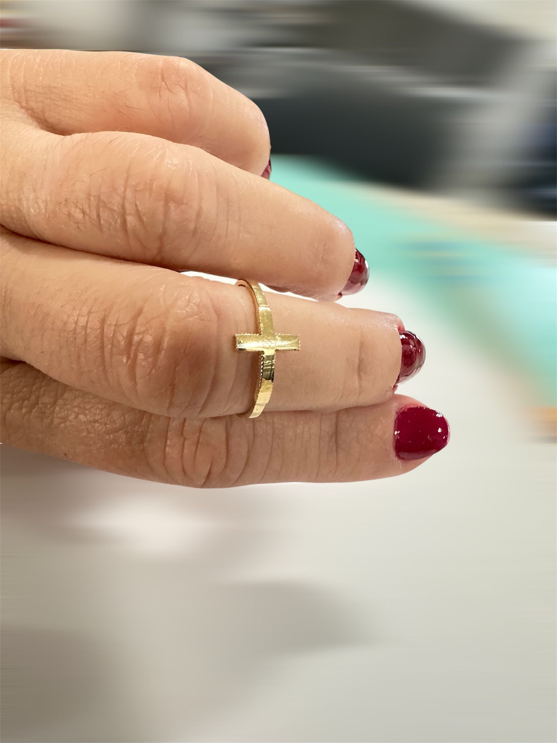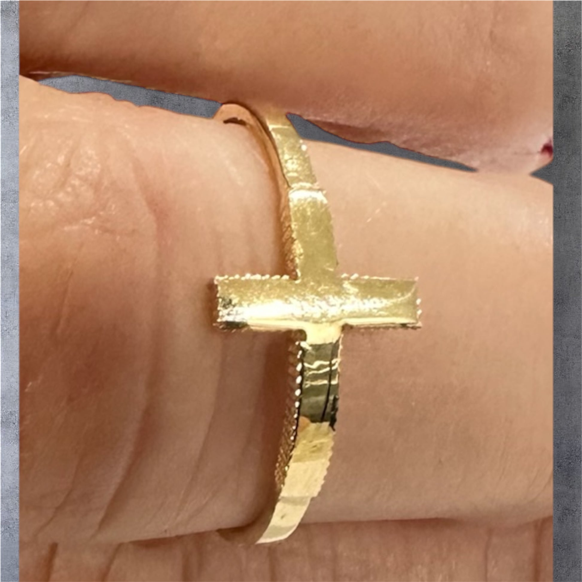 “Anillo de mujer en oro 10K con un delicado diseño en forma de cruz, símbolo de fe y elegancia. Su estilo sencillo y minimalista lo convierte en una pieza versátil, ideal para el uso diario o para llevar siempre contigo un recordatorio de espiritualidad y fortaleza.”