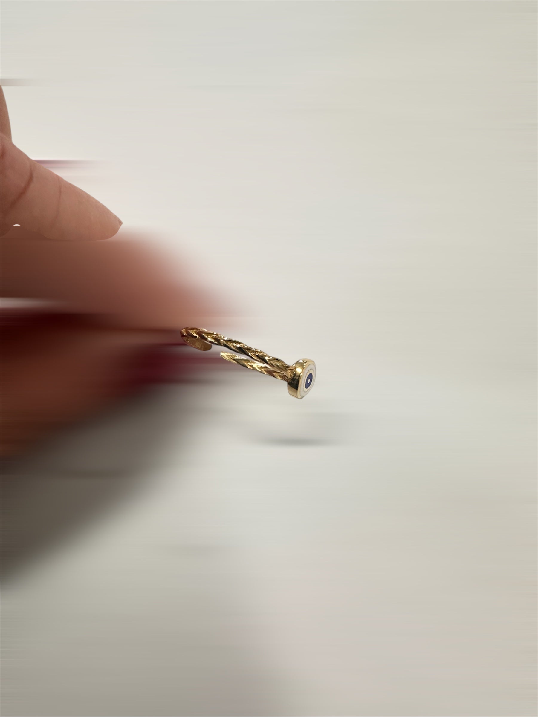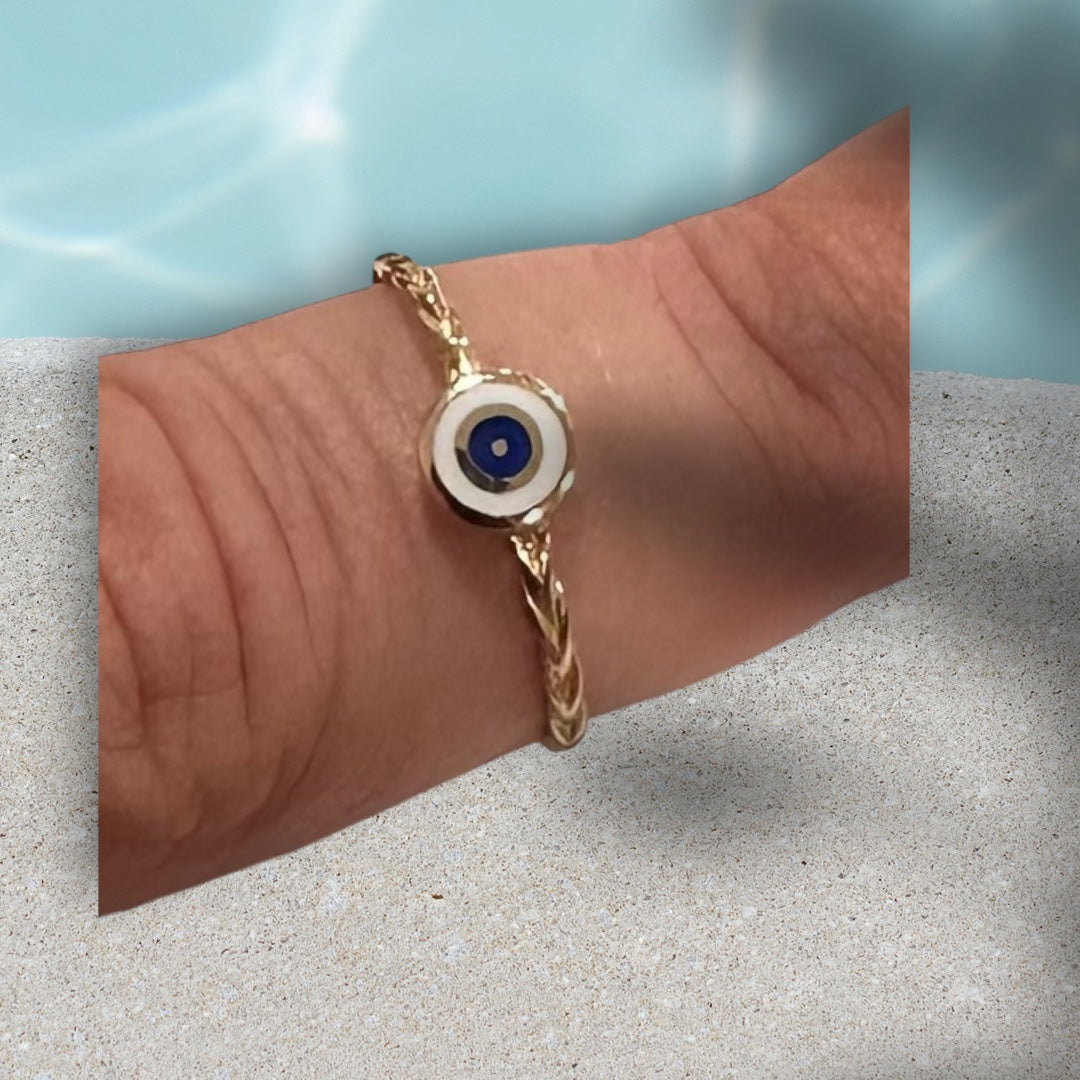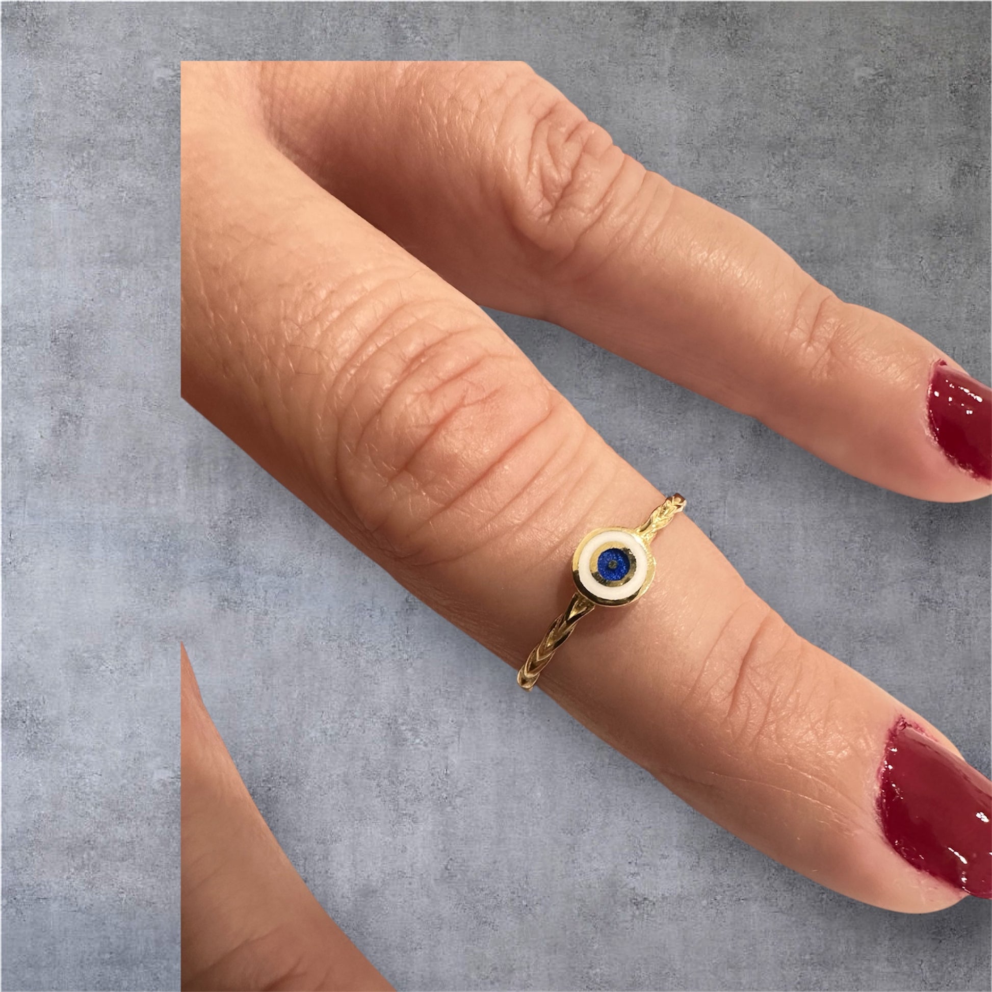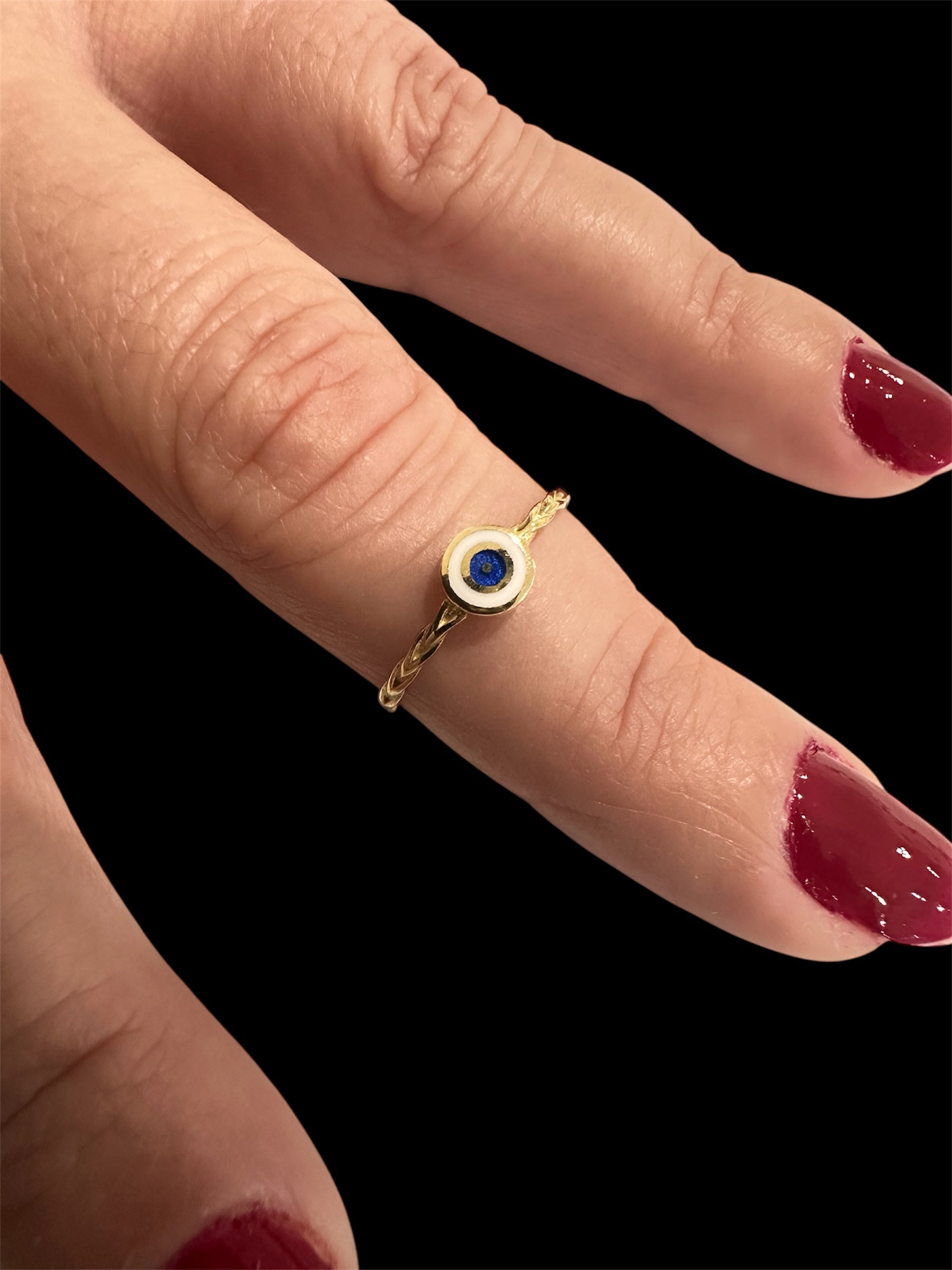“Anillo de mujer en oro 10K con delicado trabajo de trencita que realza su diseño artesanal. En el centro, un elegante detalle de ojo azul aporta un toque de protección y estilo único. Una pieza especial que combina significado, moda y distinción en cada uso.”
